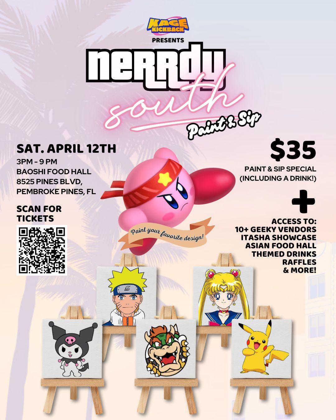 Paint your favorite character at the Nerrdy South Night Market! Join us in Pembroke Pines at @baoshifoodhall on Saturday, April 12th for shopping, raffles, food + drinks, music, anime paint & sip, and more!