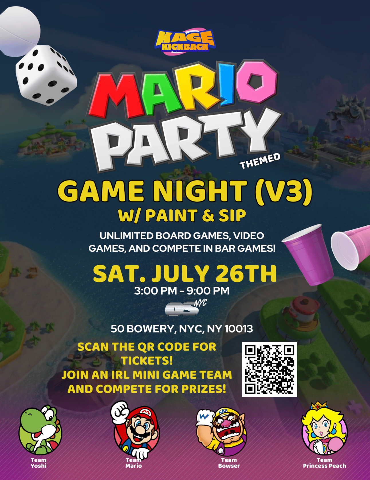 We’re BACK for another Mario Party IRL Game Night + Paint & Sip at OS NYC (50 Bowery)on Saturday, July 26th from 3PM - 9 PM!