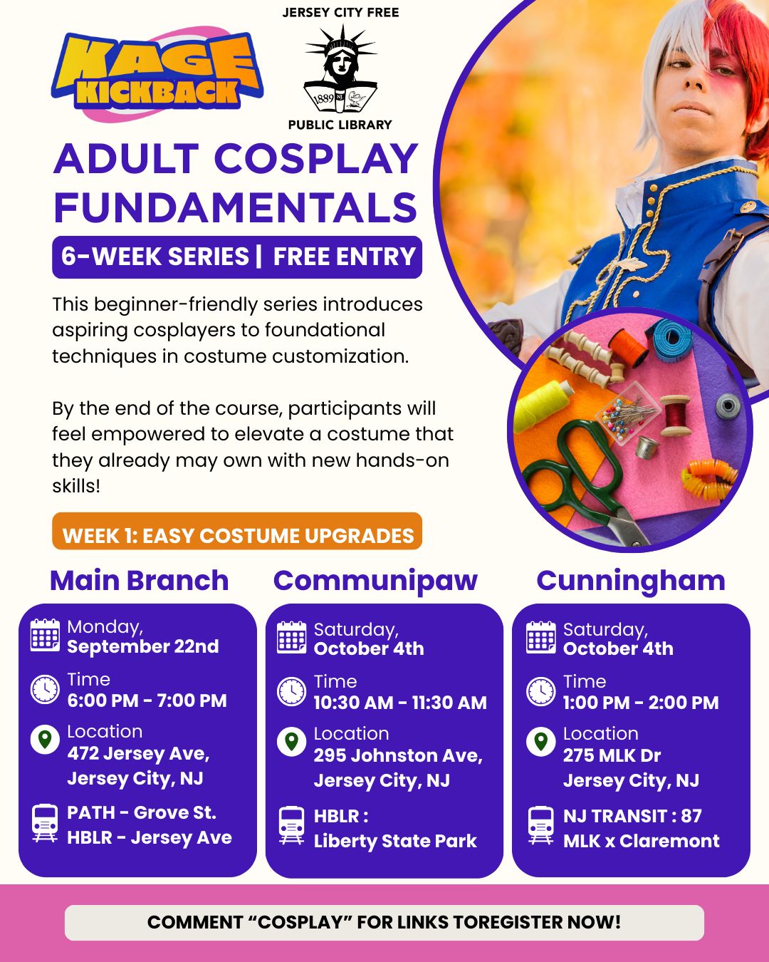 We’re teaming up with Jersey City Free Public Library for a FREE 6-week Adult Cosplay Fundamentals series at THREE branches! 🎨✂️